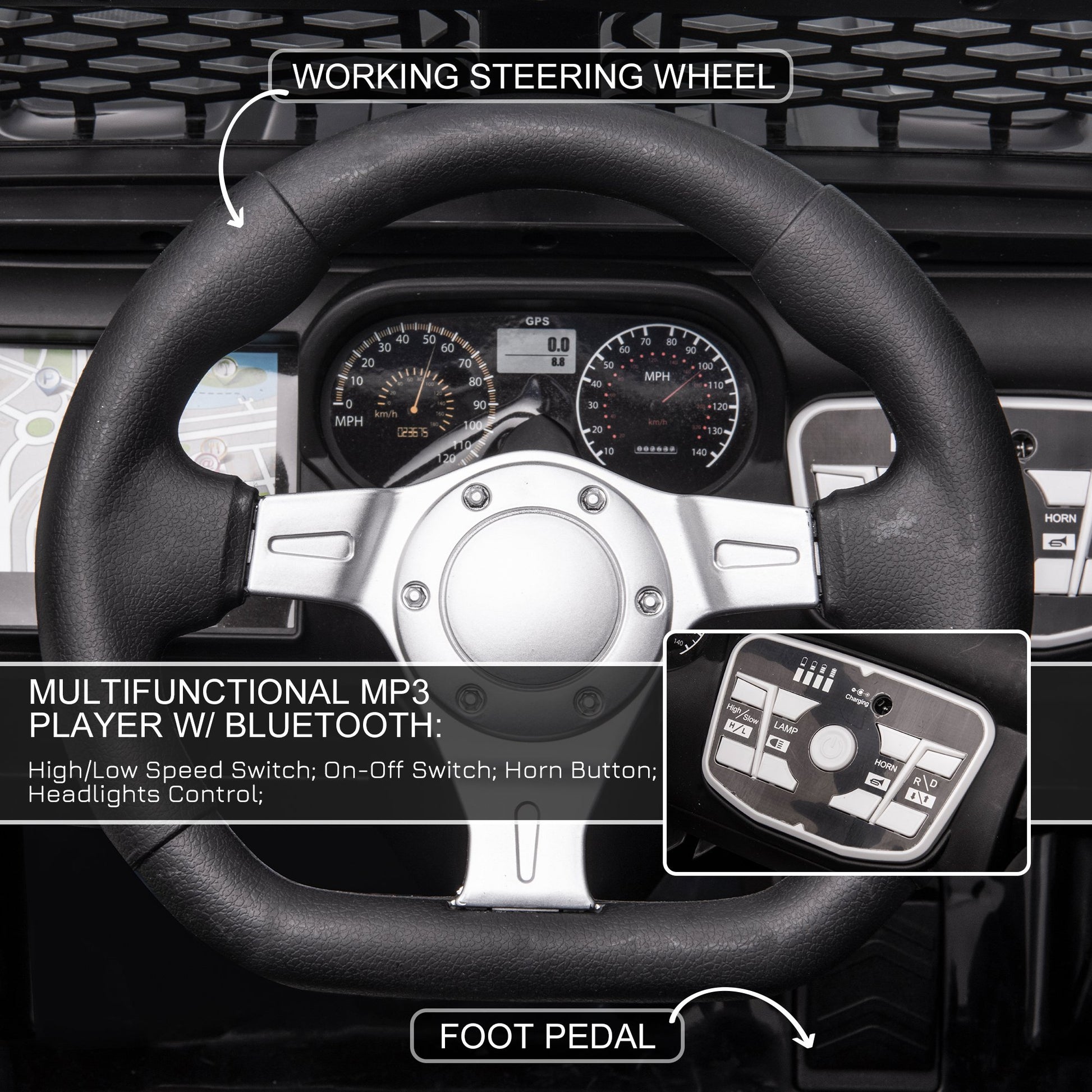 - - Working headlights, steering wheel, and horn