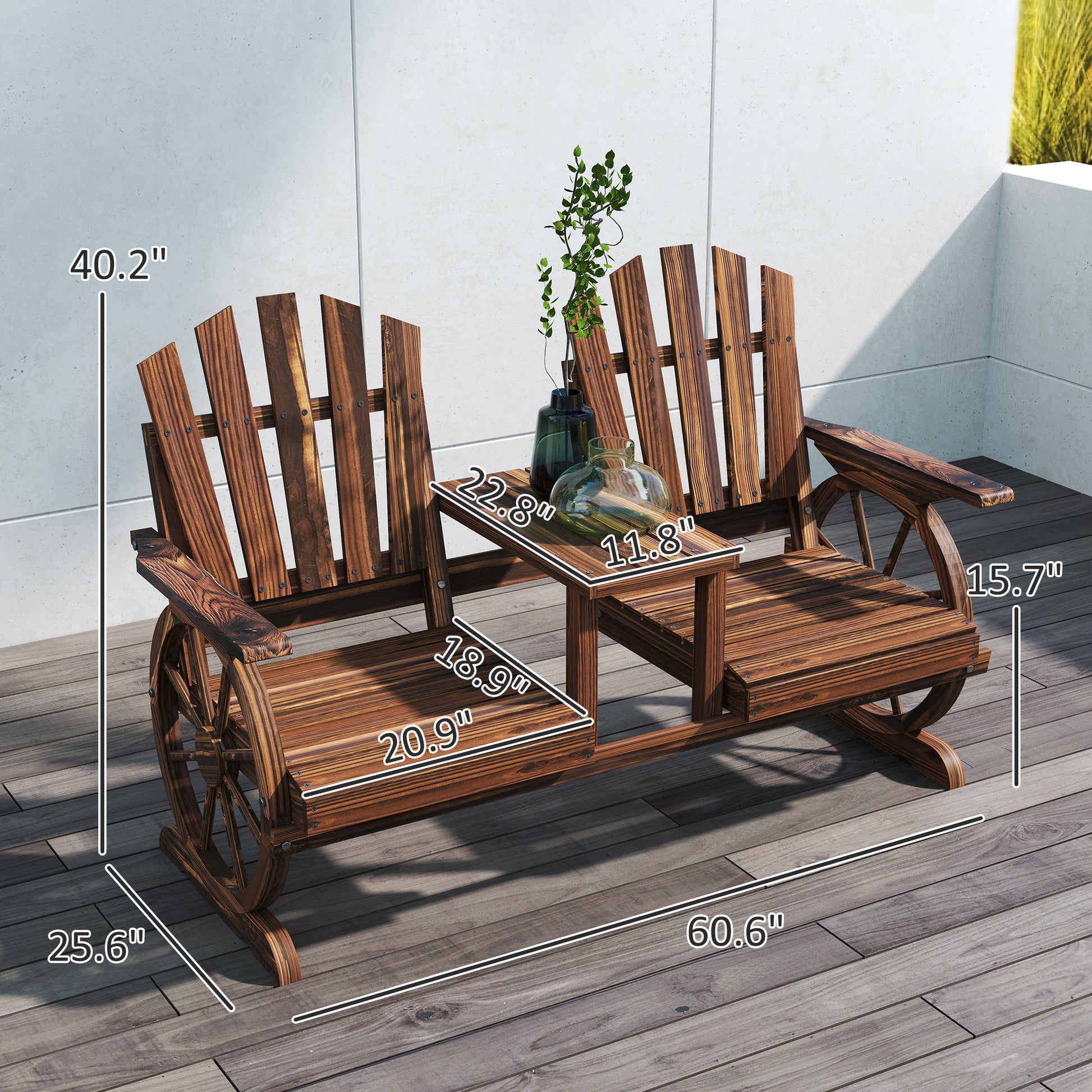 2-Seat Wooden Garden Bench With Table, Umbrella Hole, High Backrest, Armrests For Backyard, Patio, Garden, Carbonized