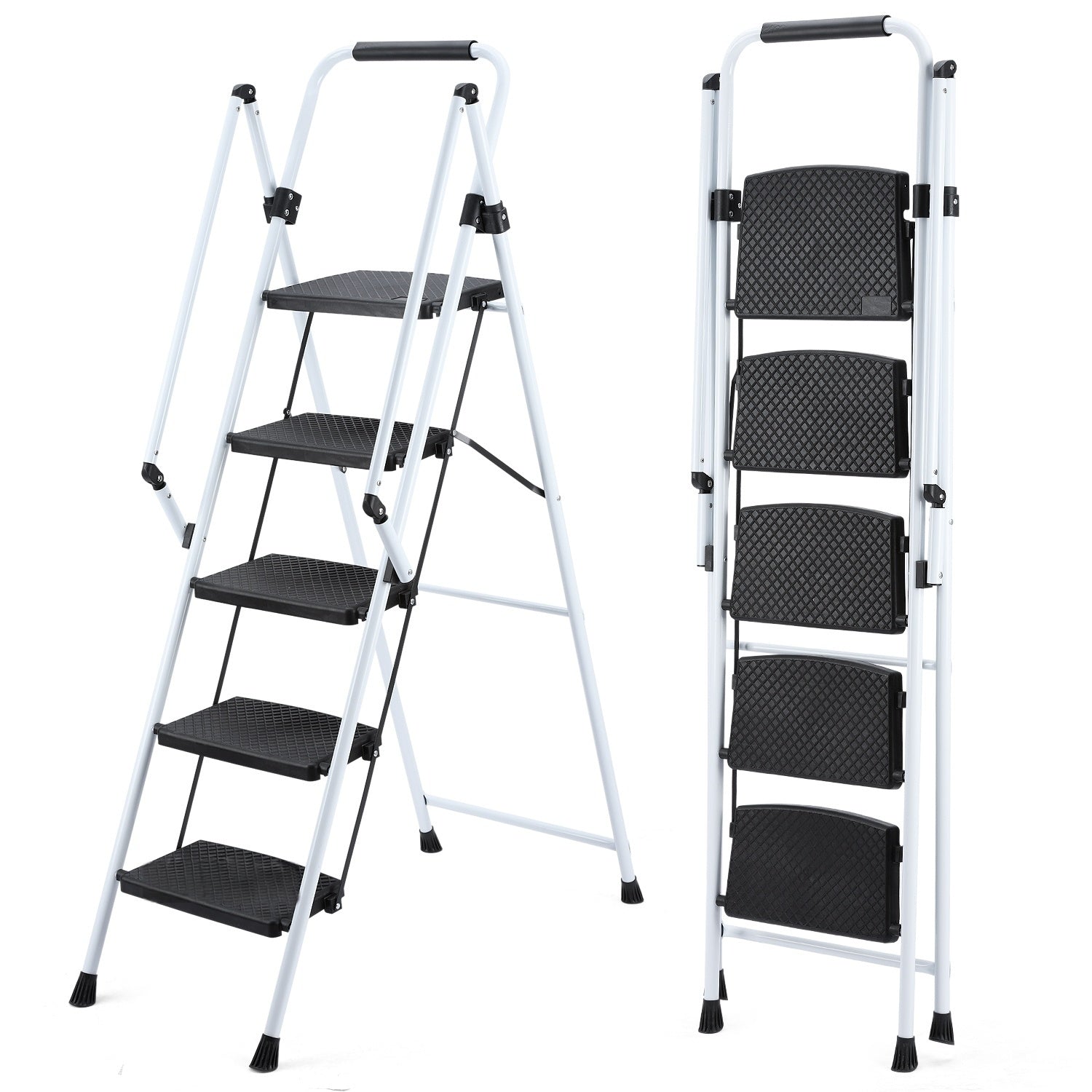 Ladder, Folding Ladder Stool, With Anti Slip Wide Pedals, Steel Ladder, With Safety Anti Slip Handle, Lightweight 330 Pound Portable Steel Ladder Stool In White 5 Steps