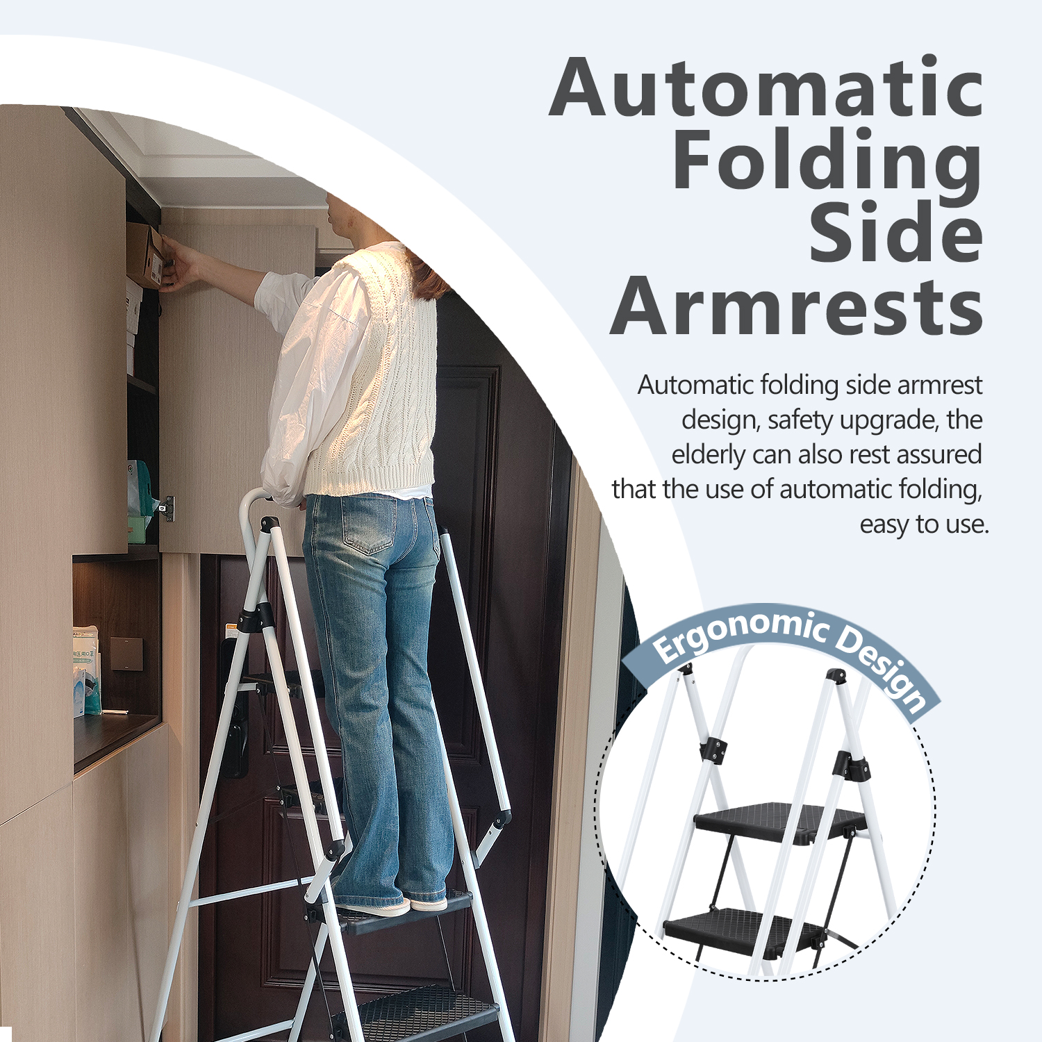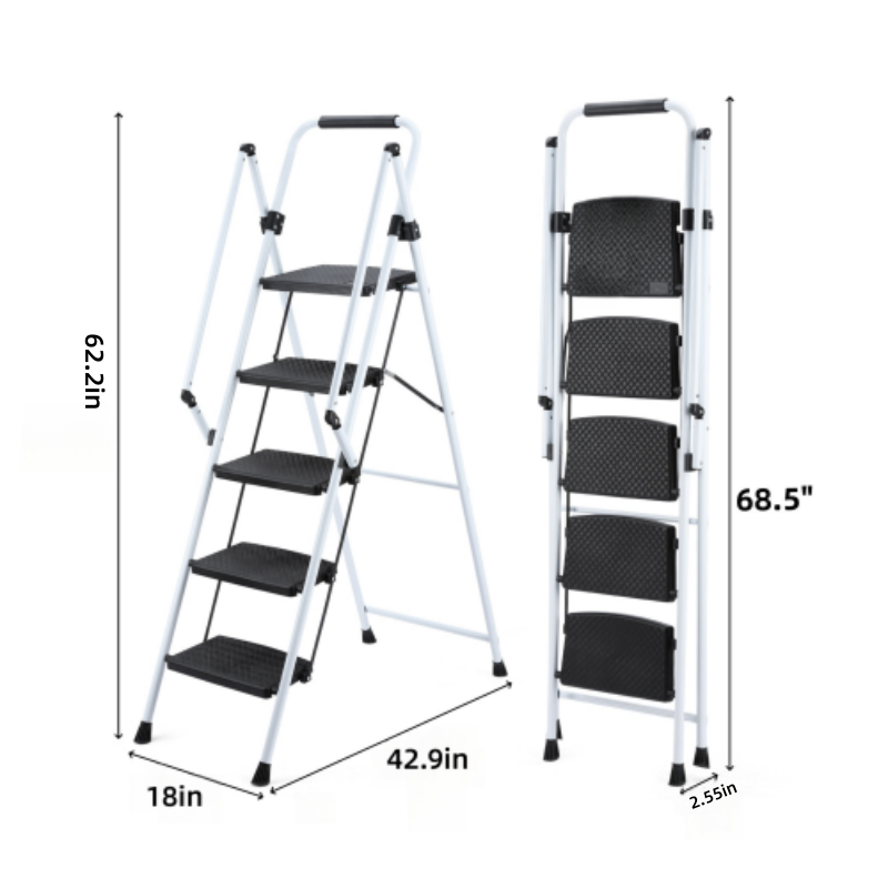 Product Name:ladder, folding ladder stool, with anti slip wide pedals, steel ladder, with safety anti slip handle, lightweight 330 pound portable steel ladder stool in White 5 steps