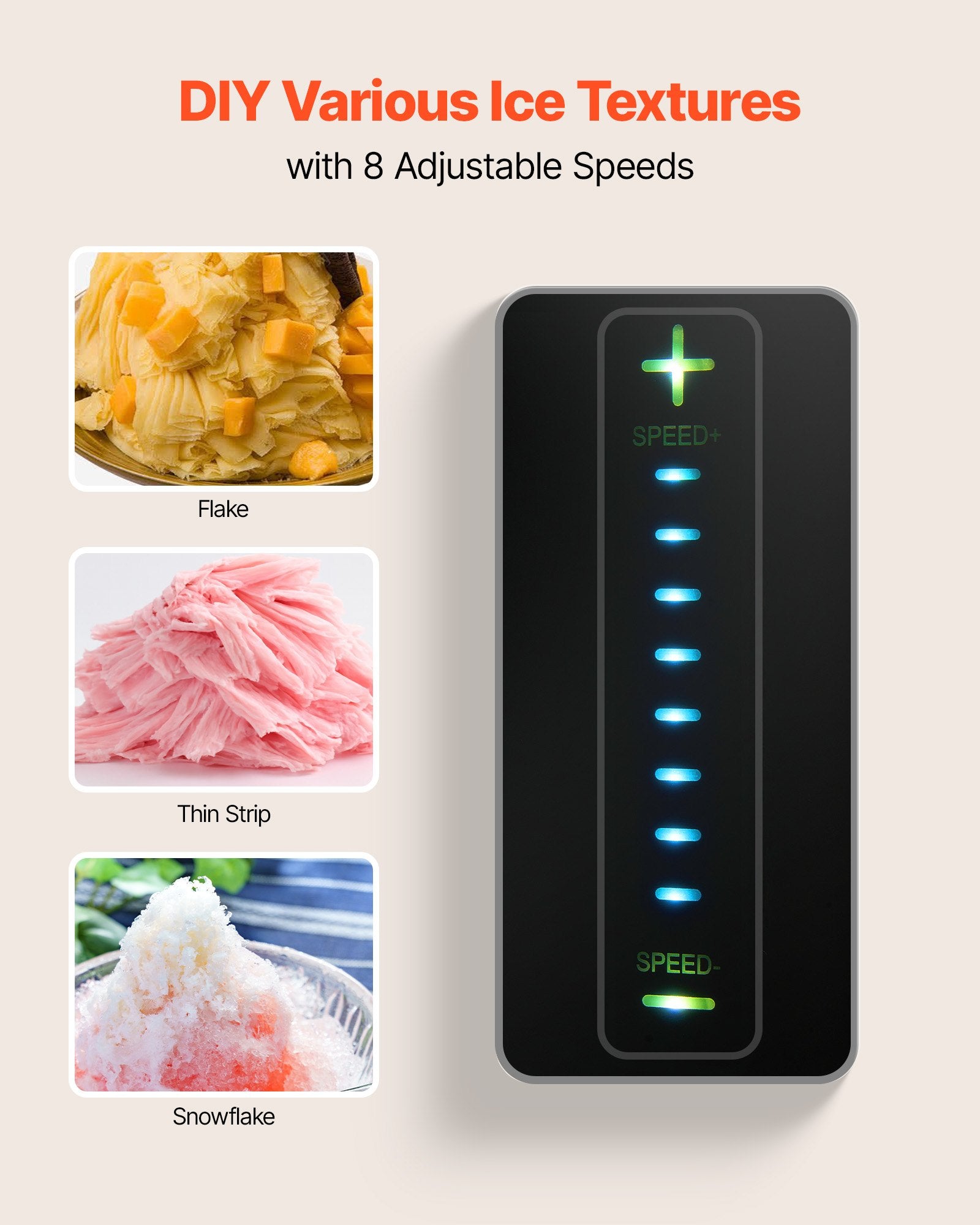 8 Adjustable Speeds: With 8 adjustable speeds, this snowflake ice maker lets you create different textures such as fluffy snowflake ice, thin strips, noodle-like ice, or flakes, giving you smooth and refreshing desserts every time