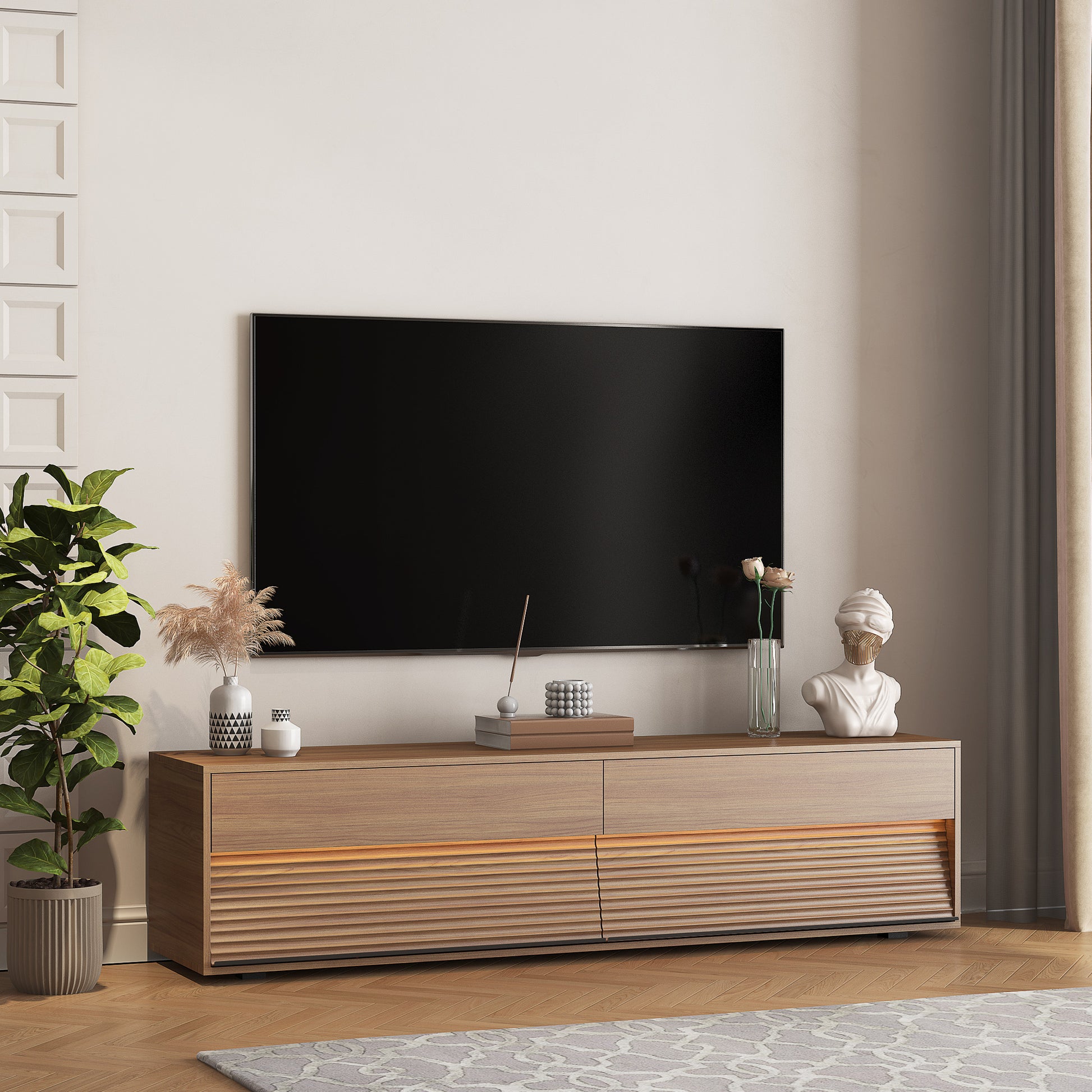- This TV stand has a large storage space, perfect for storing TV components, game accessories, books and decorations. You can also place living room decorations on the TV stand.