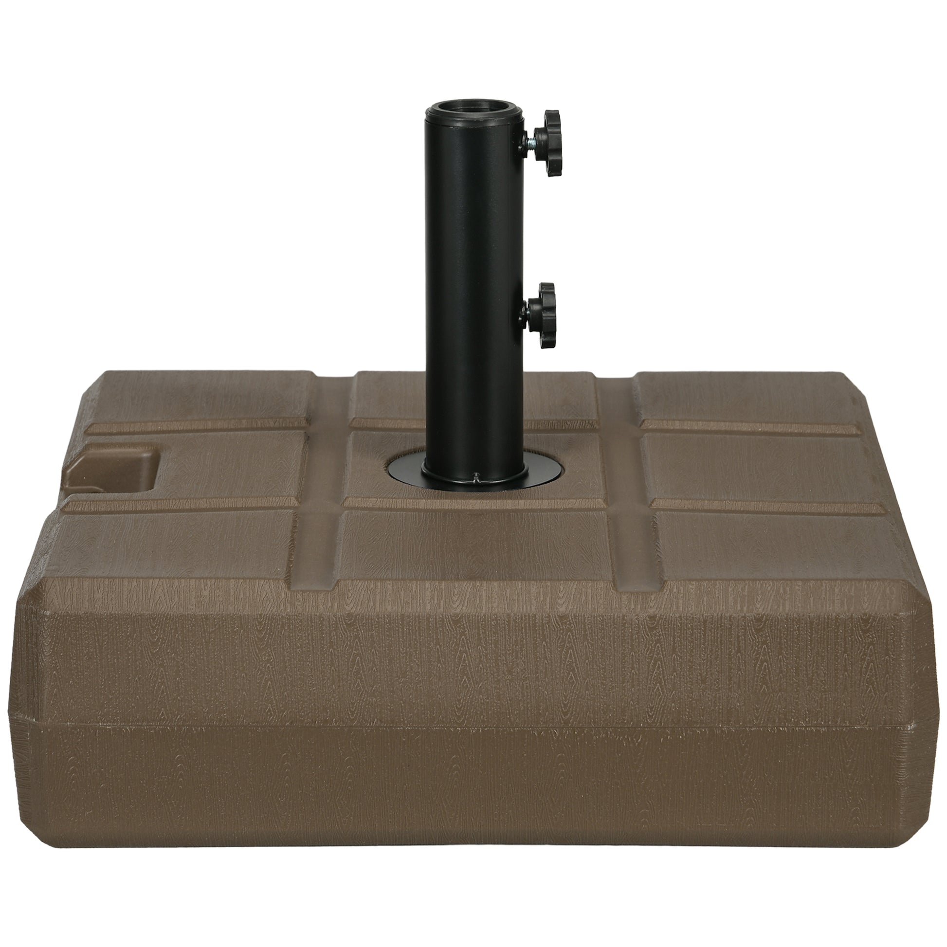 An [BRAND NAME] umbrella base doesn't just help your umbrella stand up it adds a delightful accent to your patio. With a large capacity, our fillable umbrella base can weigh up to 66 lbs. when filled with water or 88 lbs. with sand. It's made of all-weather HDPE plastic with two reversible wood patterns. Two knobs secure your umbrella pole in place, allowing it to fit an array of sizes. Also, a handle built into our umbrella base makes it easy to carry when emptied. Get out, get comfy, get [BRAND NAME].