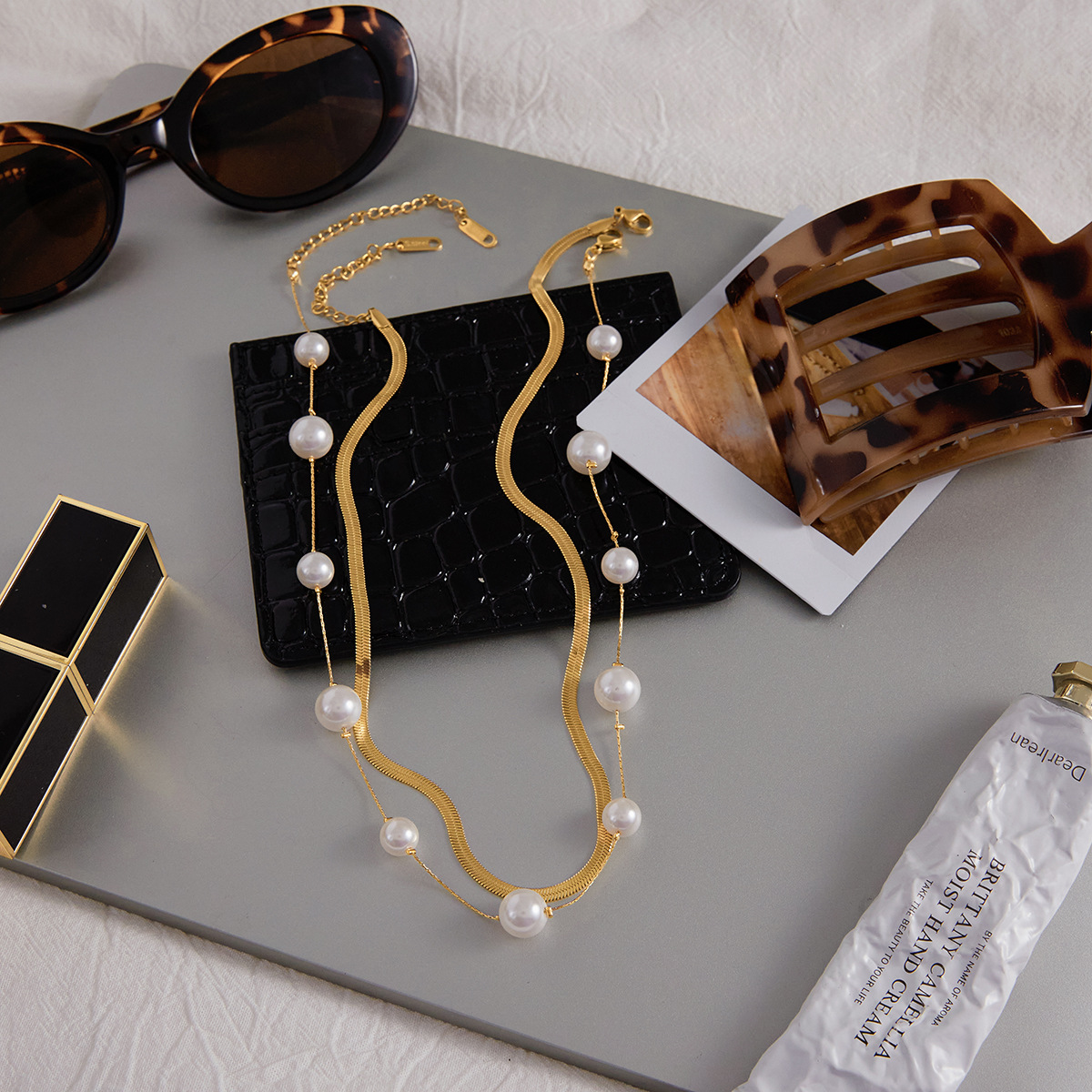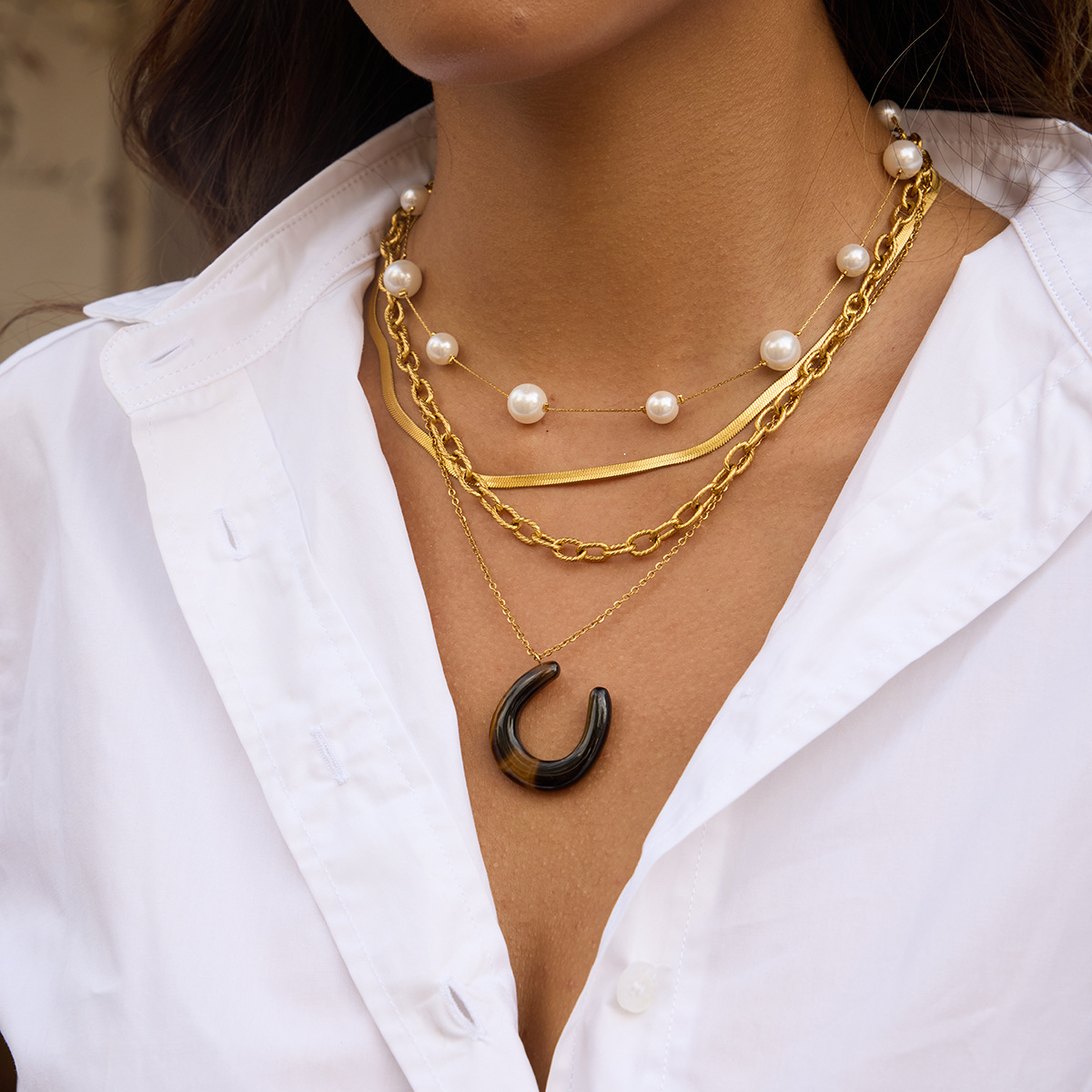 Elegant 18K Gold Stainless Steel Glass Pearl Necklace