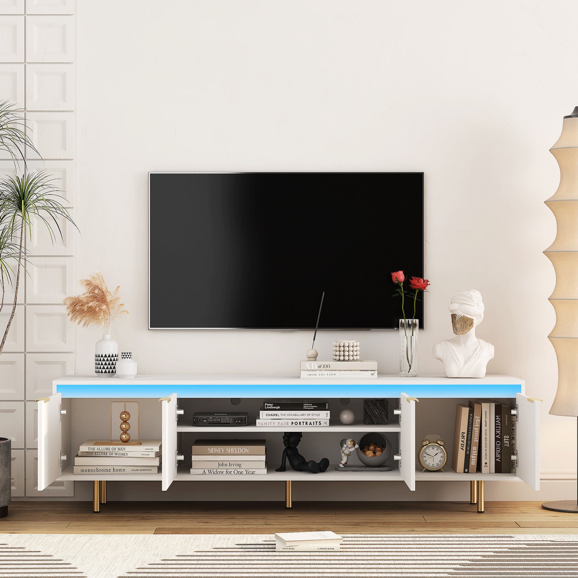 Mid Century Modern LED TV Stand For 80 Inch TV, Entertainment Center Wood TV Stand, Fluted Trim TV Stand With 4 Doors