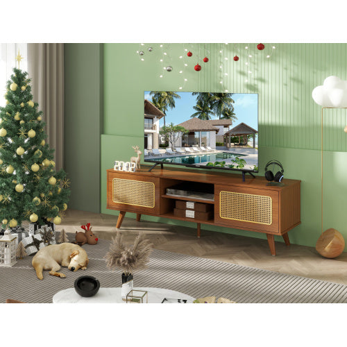 Product Name:Mid Century Modern Rattan TV Stand for 55/60/65 inch TV , Entertainment Cabinet, Media Console for Living Room Bedroom Media Room, Solid Wood Feet & Rattan Cabinet Doors (Walnut, 59")