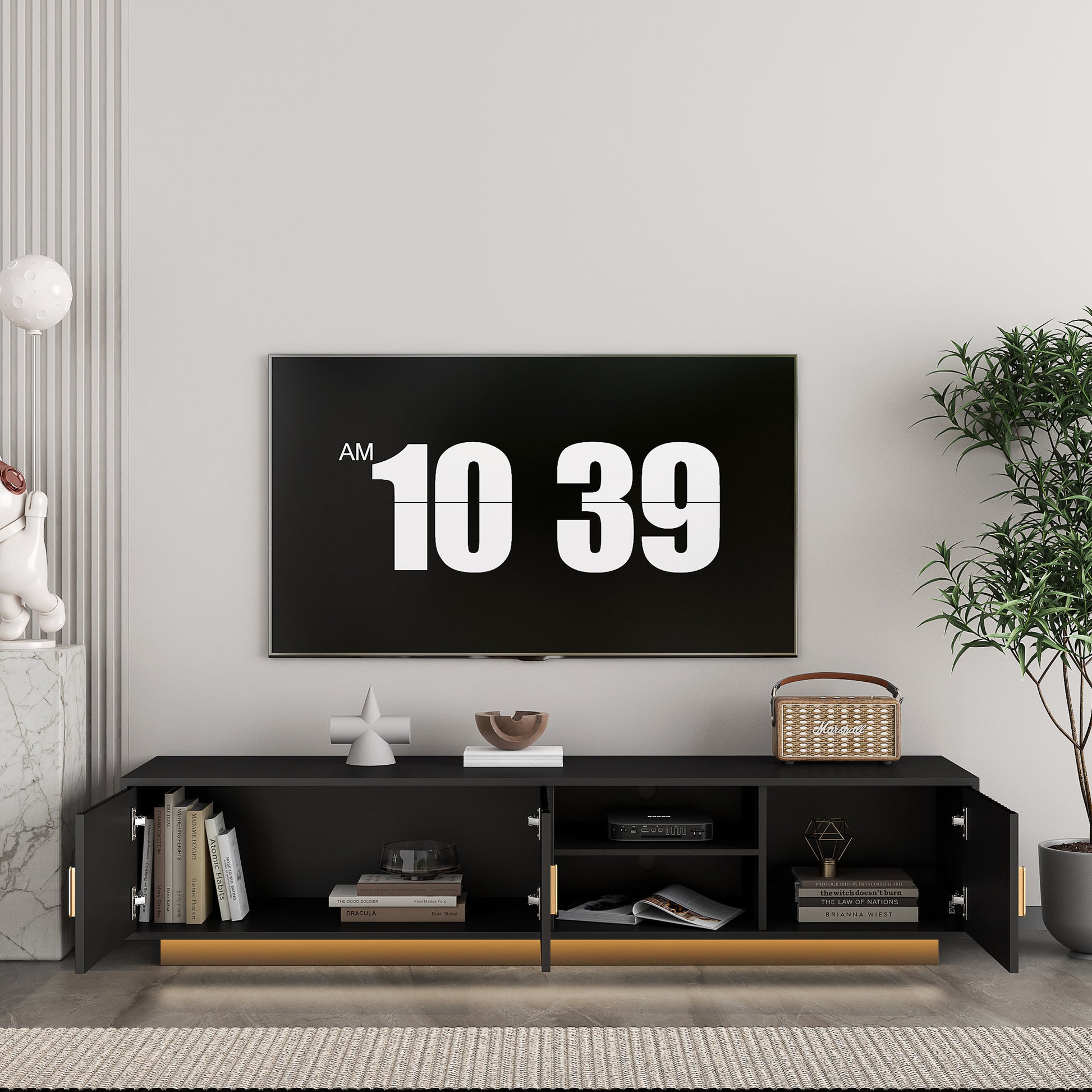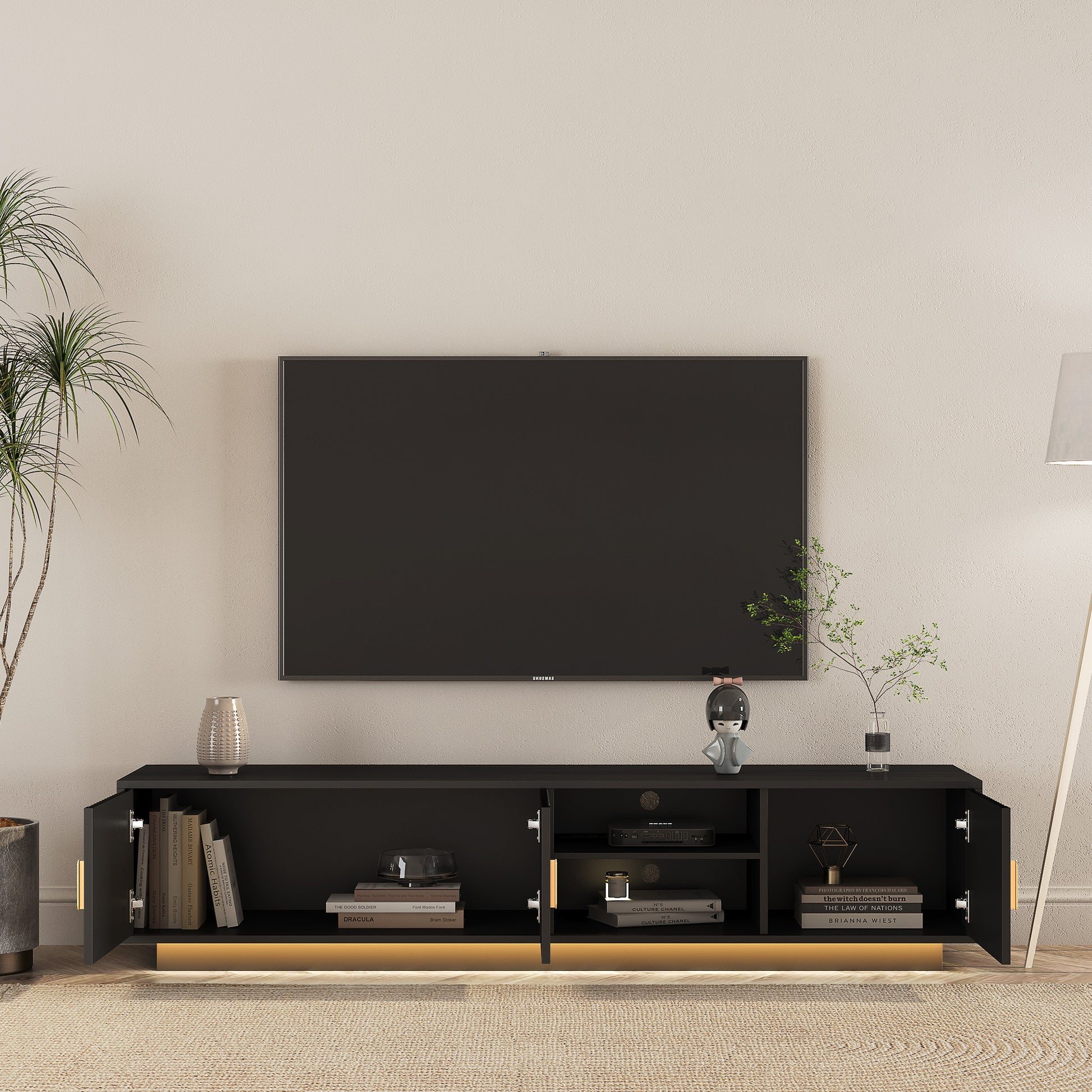 - High Quality Materials: The TV cabinet is made of selected MDF boards and environmentally friendly particle boards, which are safe and durable. The waterproof finish on the surface makes daily cleaning easier.