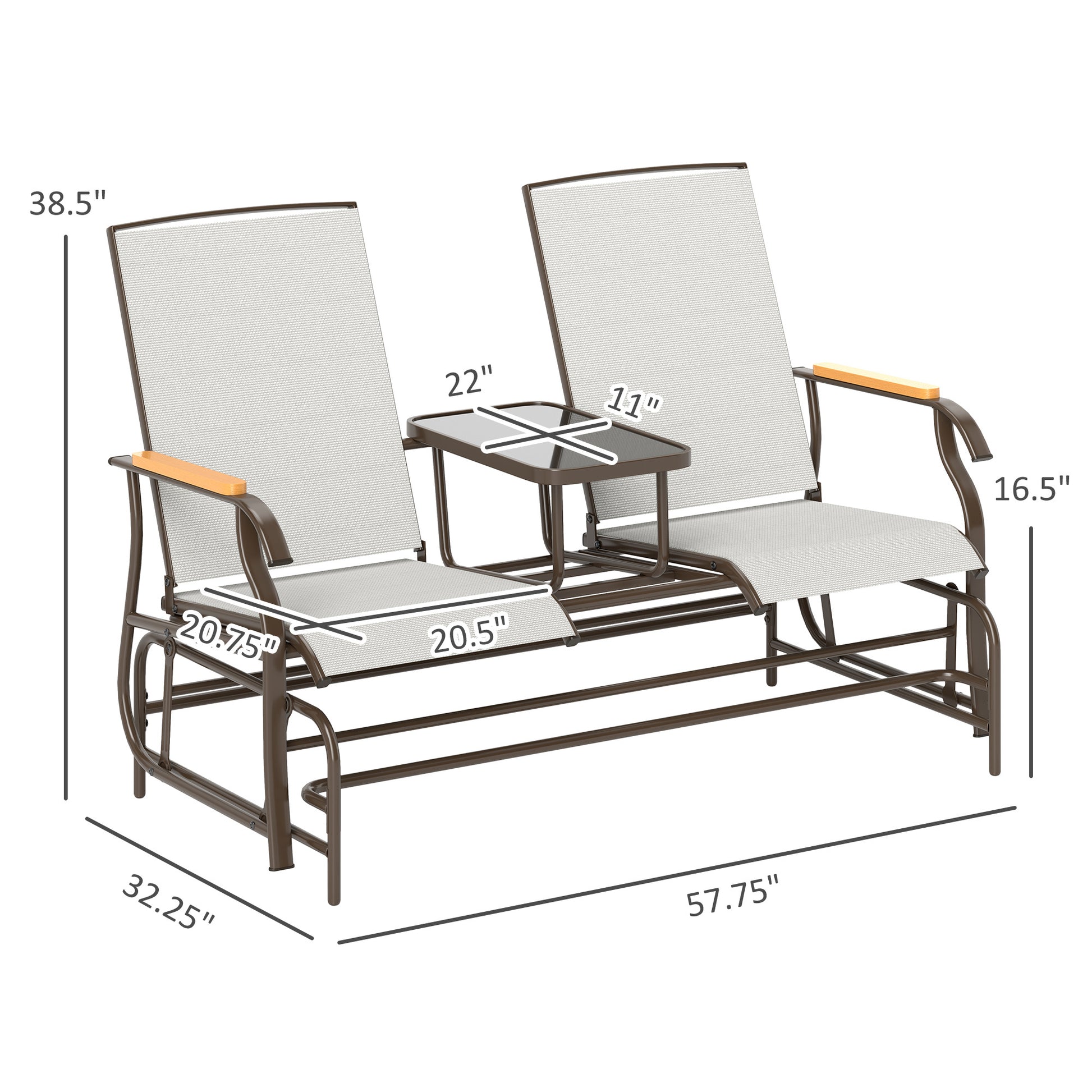 Outdoor 2-Person Glider Bench, Outside Glider Swing Chair Loveseat With Table, Steel Frame, Cream White