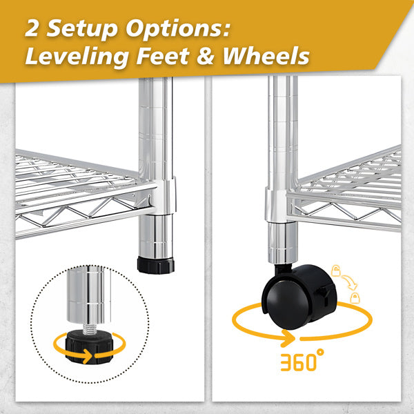 3. load-bearing industrial wheels (2 lockable). The wire storage rack with wheels can easily place products anywhere you need. Anti slip, will not scratch the ground. Metal storage shelves are the perfect choice for gift giving or housewarming.
