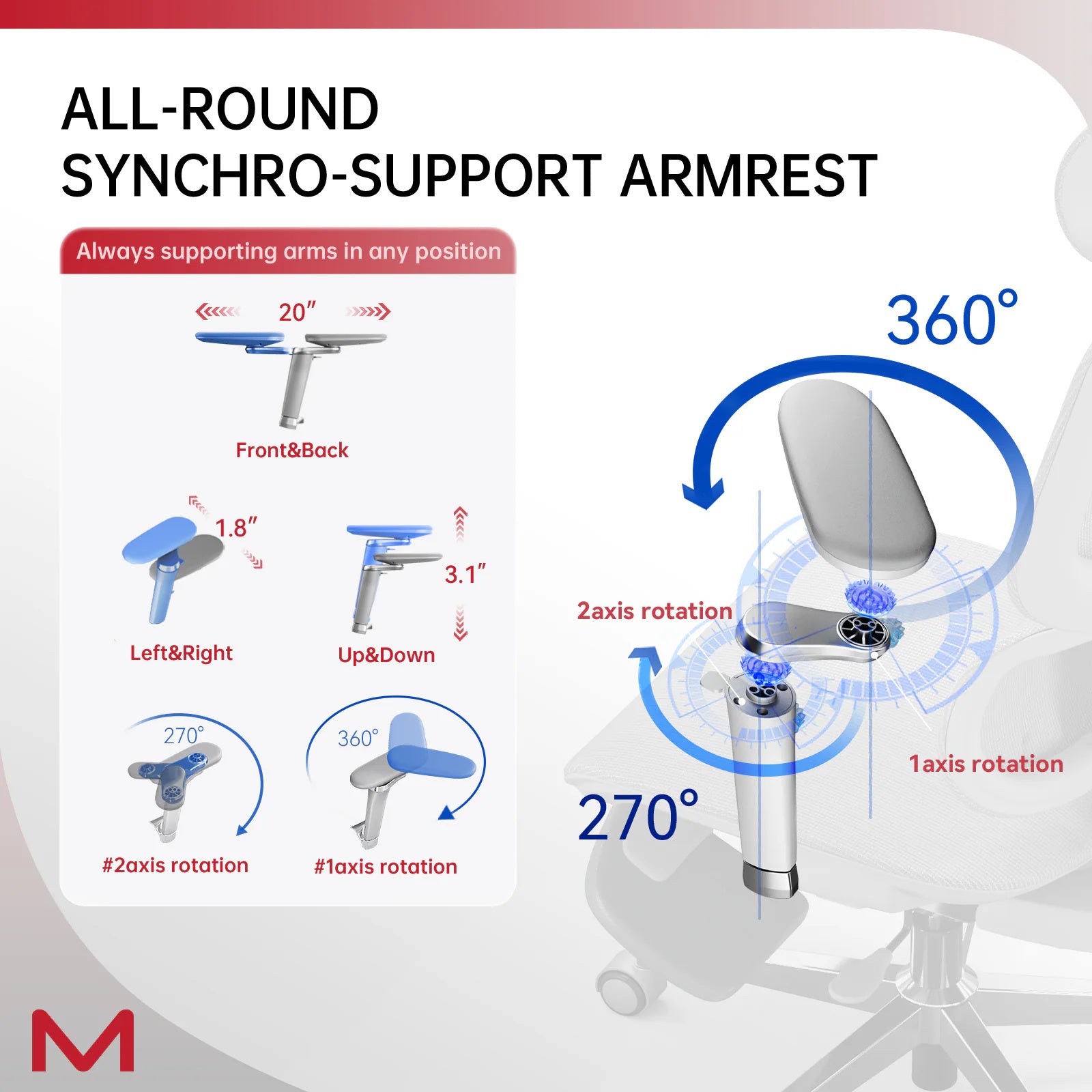 - All-rounded Synchro-Support Multi-Adjustable Armrest - The armrests of this ergonomic chair support 20” front & back adjustment, 1.8” left & right adjustment and 3.1” up & down adjustment to get the most comfortable sitting posture as you need. This armrest supports 360°1st axis rotation and 270°2nd axis rotation, which provides comprehensive arm supports in any gestures you want, even when reclining. The armrests are made with skin-friendly PU leather to provide you with more comfortable support. No matter what your need: eating, working, reading, resting or gaming, the multi-adjustable armrest could provide you the best comfy and relaxing experience.
