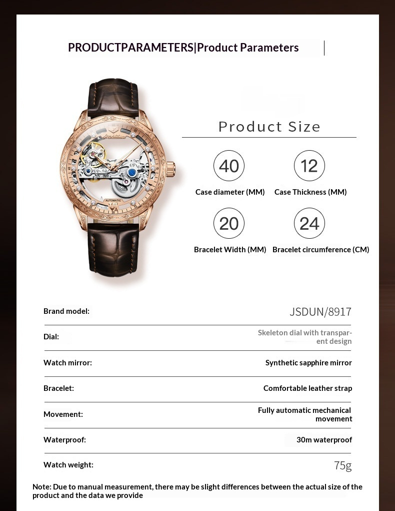 Color: 8917 brown leather strap with rose gold case and rose gold dial (men’s model), 8917 brown leather strap with rose gold case and white dial (men’s model), 8917 black leather strap with rose gold case and black dial (men’s model), 8917 black leather strap with natural white finish (men’s model), 8917 black leather strap with natural black finish (men’s model)