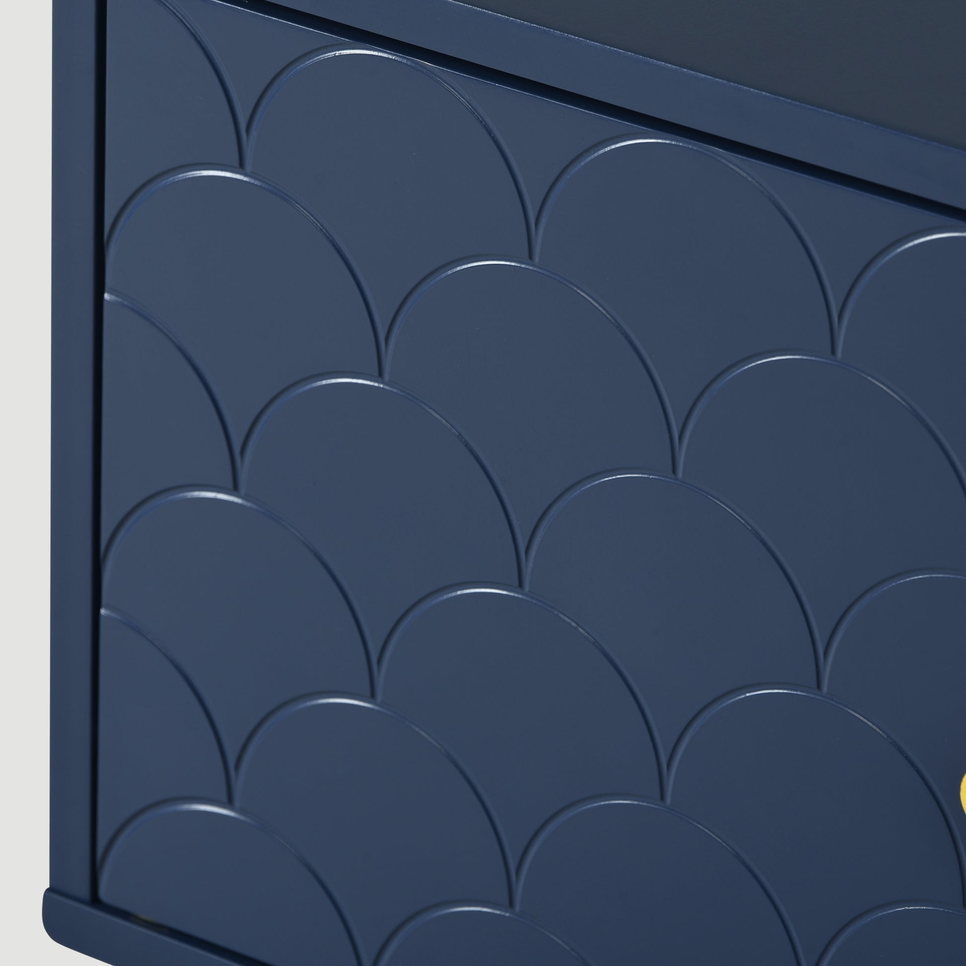 - Einzigartige Platte mit Fischschuppenmuster: Das marineblaue Fischschuppenmuster und die champagnerfarbenen Metallbeine verleihen diesem Schrank eine elegante Präsenz im Schlaf- und Wohnzimmer.Das Produkt ist mit hochwertigen Metallscharnieren ausgestattet, die es ermöglichen,die Abstände zwischen den Türen und Schubladen zu regulieren, wodurch die Platten ein kohärentes und ästhetisch ansprechenderes Fischschuppenmuster erhalten.